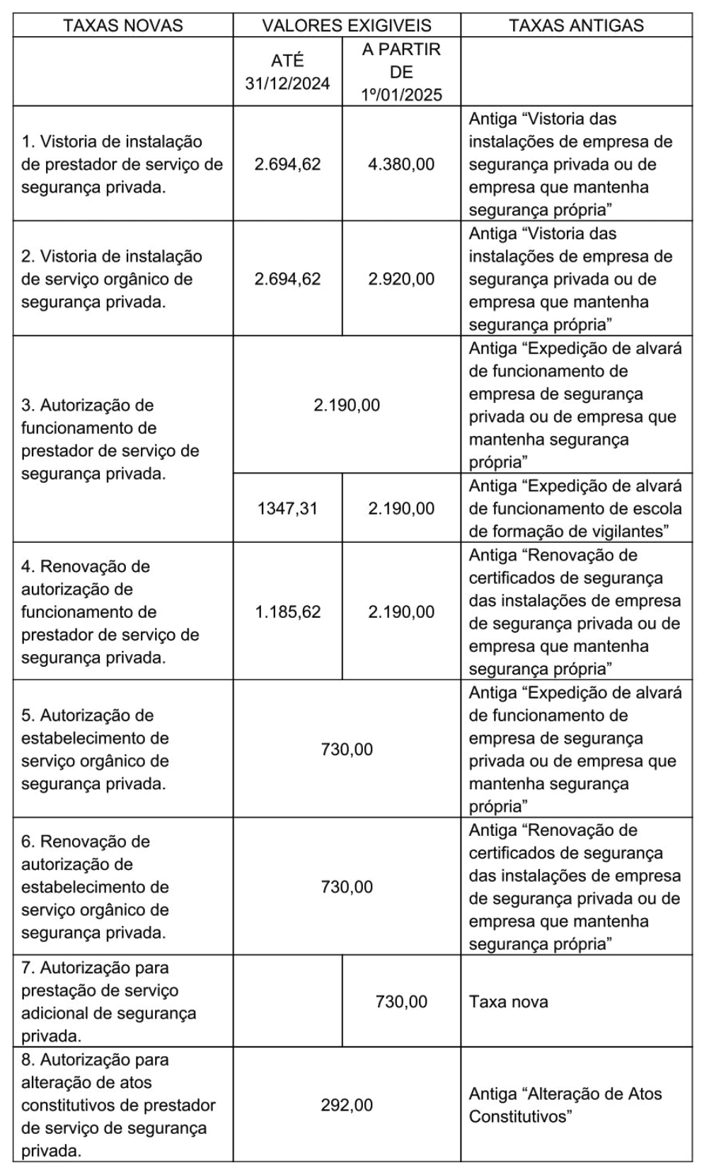TAXAS EM VIGOR E TAXAS QUE PASSARÃO A VIGORAR A PARTIR DE 01/01/2025 – CONFORME N.I. Nº 001/2024-CGCSP/DPA/PF – Lei 14.967, de 09/09/2024